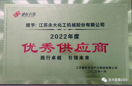 江蘇永大化工機械股份有限公司被江蘇盛虹石化產(chǎn)業(yè)集團有限公司授予優(yōu)秀供應(yīng)商榮譽稱號。